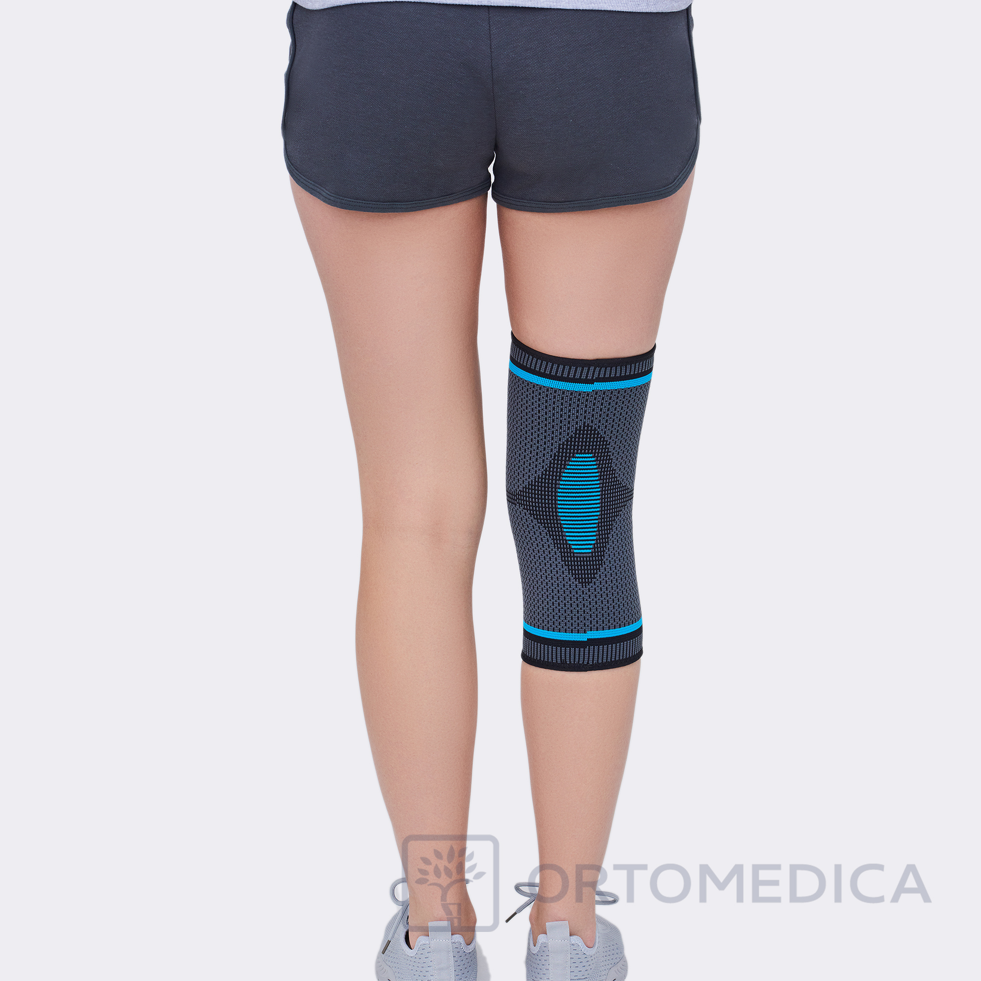 Специальная вязка с разной степенью плотности. Стабилизирует сустав и коленную чашечку. Уменьшает отек и боль. Улучшает кровоснабжение тканей вокруг сустава. Разреженная зона облегчает сгибание-разгибание.