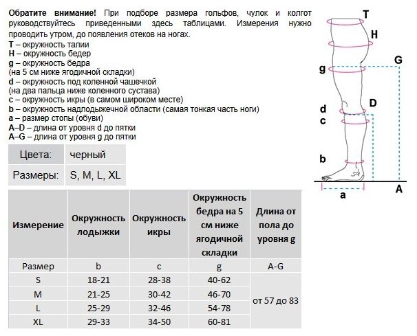 Обратите внимание! При подборе размера гольфов, чулок и колгот руководствуйтесь приведенными здесь таблицами. Измерения нужно проводить утром, до появления отеков на ногах.